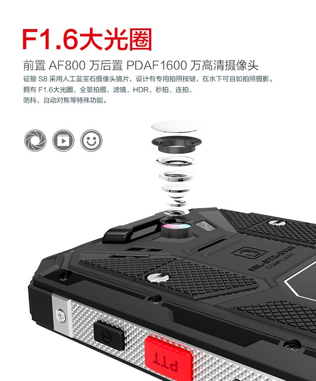 征服 S8 双认证防爆手机通过了国家专业的CTA入网检测,中华人民共和国工业和信息化部的电信设备进网许可证、国家级防爆合格证、CCC国家3C强制性检测认证等;权威瑞士SGS认证IP68证书! 征服 S8 防爆手机三证齐全!