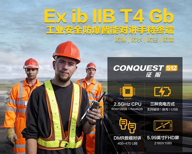 工业T4本安防爆智能手机征服CONQUEST S12(防爆版)外壳采用V0阻燃材料,内部使用经过特殊防爆处理的电池,以确保手机在危险环境下的使用安全,拥有国家认证的防爆证书和防爆标识,可以应用到石油、煤炭、燃气等行业,但不能应用在矿井下。