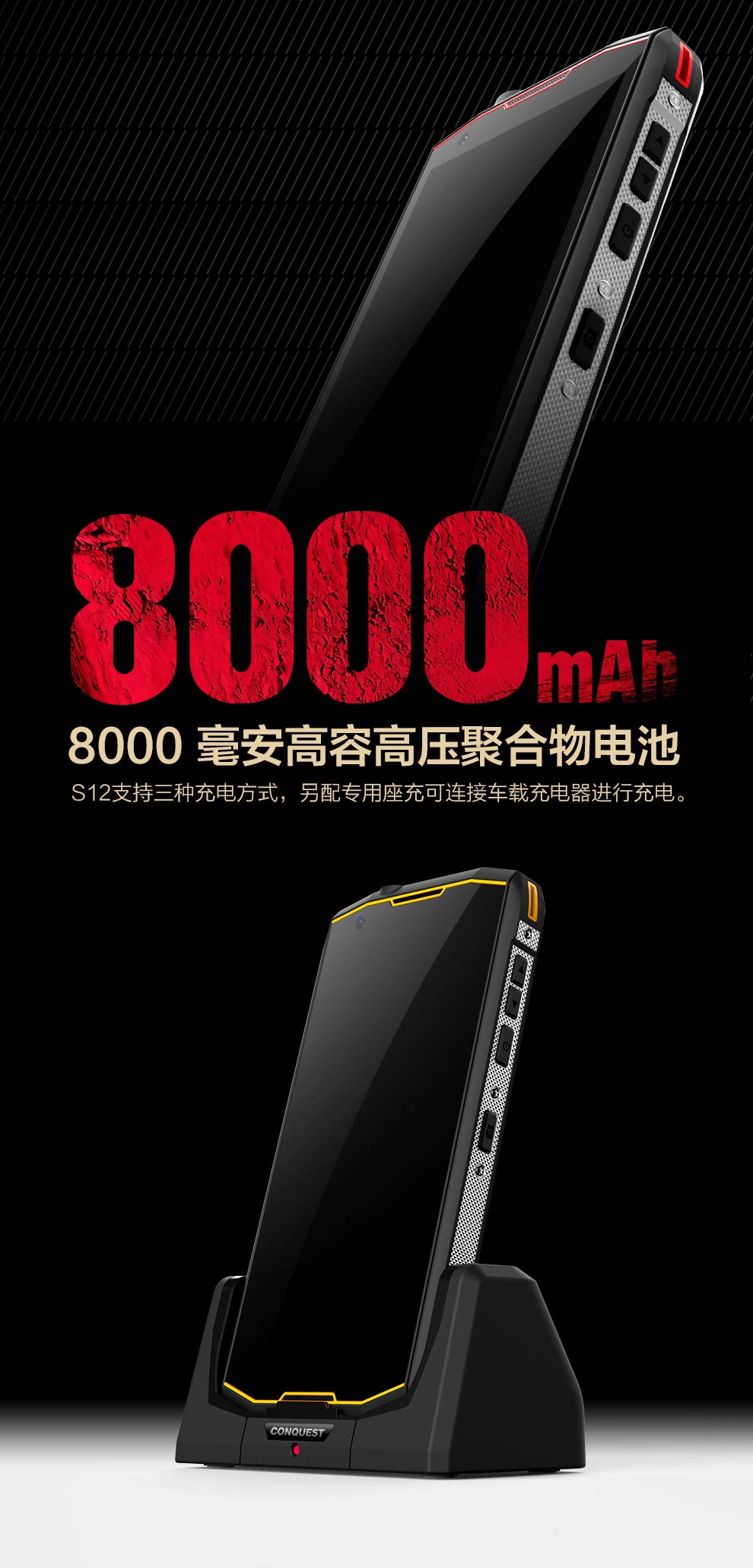 在这款手机身上,征服(CONQUEST)S12也发挥了自己的专长:续航能力。征服(CONQUEST)S12配备了一块8000mAh大容量电池,这在目前的手机市场上可不多见。如果你对手机续航有着很高的要求,那这款手机的表现绝对能让你满意。