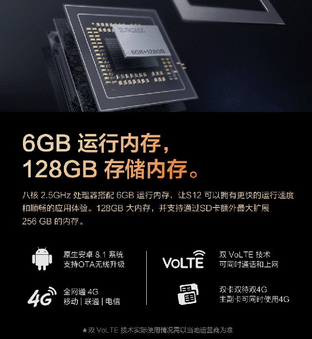 征服(CONQUEST)S12内置MTK6763 2.5GHz八核(Eight-Core)P23 处理器和 Android 8.1.0系统,轻快高速,再加上4+64G,6+128G的超大内存,屏幕采用5.99英寸FHD高清显示屏,比例为 18∶9分辨率为 2160 × 1080,无论游戏、追剧还是日常使用都可畅快淋漓。 征服(CONQUEST)S12后置2100万的摄像头和后置指纹竖排放置放在手机中轴线上,轻松拍出更加清晰美好的场景。