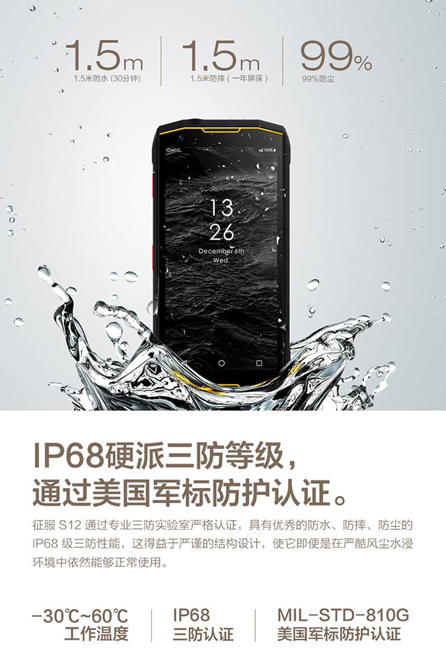 下面我们就开说说这部专注于户外手机的征服(CONQUEST)S12。提起户外手机,大多数人的第一反应就是三防。征服(CONQUEST)S12通过了条件严苛的IP68认证,机身采用专业级抗摔材质,1.5m高度跌落各种材质界面无破损隐患,1.5米水深浸泡30分钟无进水隐患,密封防尘度更是高达到99%。