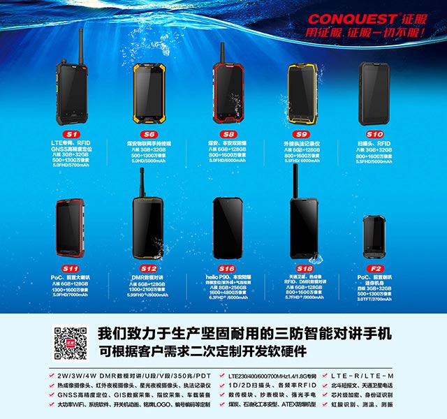 三防领域的老牌厂商CONQUEST,在步入智能时代后进行技术革新,推出了CONQUEST系列的三防智能手机,在保证与寻常智能手机有着同样流畅度的同时,达到最高防护等级IP68,恶劣环境下仍可使用。因受到高度认可,CONQUEST三防手机还作为军工用机还植入于《红海行动》和《流浪地球》中,高品质和专业防护是其代言词。