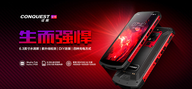 CONQUEST S16在三防领域是很经典的一款机型。6.3英寸屏幕,配上高硬度Dragontrail抗刮屏幕,手机后盖由航空金属材质和德国Bayer软胶构成,达到了力学构造上的抗震,能够实现多角度的防摔,使整台手机风格硬气。