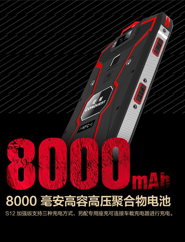 CONQUEST征服工业防爆手机,是专业定制工业防爆手机的厂商,除了给大家更结实、更安全、更可靠的工业手机外,还针对产品进行了优化,使用S12拥有噪音测试、指南针、水平仪、手电筒、心率、放大镜、铅锤、量角器、海拔气压等使用功能。支持NFC近场通信技术,无线是做身份证别、数据传输、NFC巡检都是可以全面兼容。