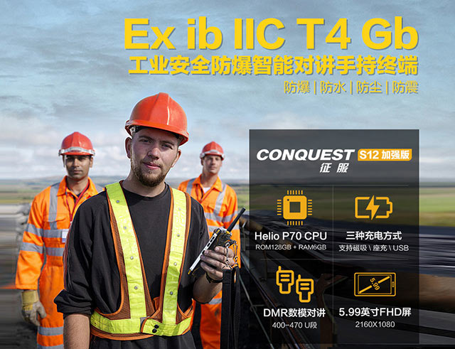 CONQUEST征服 S12工业防爆手机除了支持POC无线网络对讲,还支持DMR数模一体硬件窄带专网对讲,支持400MHZ-450MHZ对讲频段。是征服品牌第一款DMR数模一体对讲三防智能通讯终端,支持LTE 4G通信、数字对讲、模拟对讲、POC公网对讲手机,采用八核处理器、5.99英寸FHD+(2160*1080)高清分辨率。八核2.5GHZ处理器、支持6G+128G机身存储,可支持512GB内存。原生安卓9.0操作系统,4G双VOLTE技术可同时通话上网。2100万后置摄像头、专业F/1.8大光圈、PDAF相位对焦。不仅可以拍出高清照片,还可进行水下拍摄,光线阴暗地区拍照等。