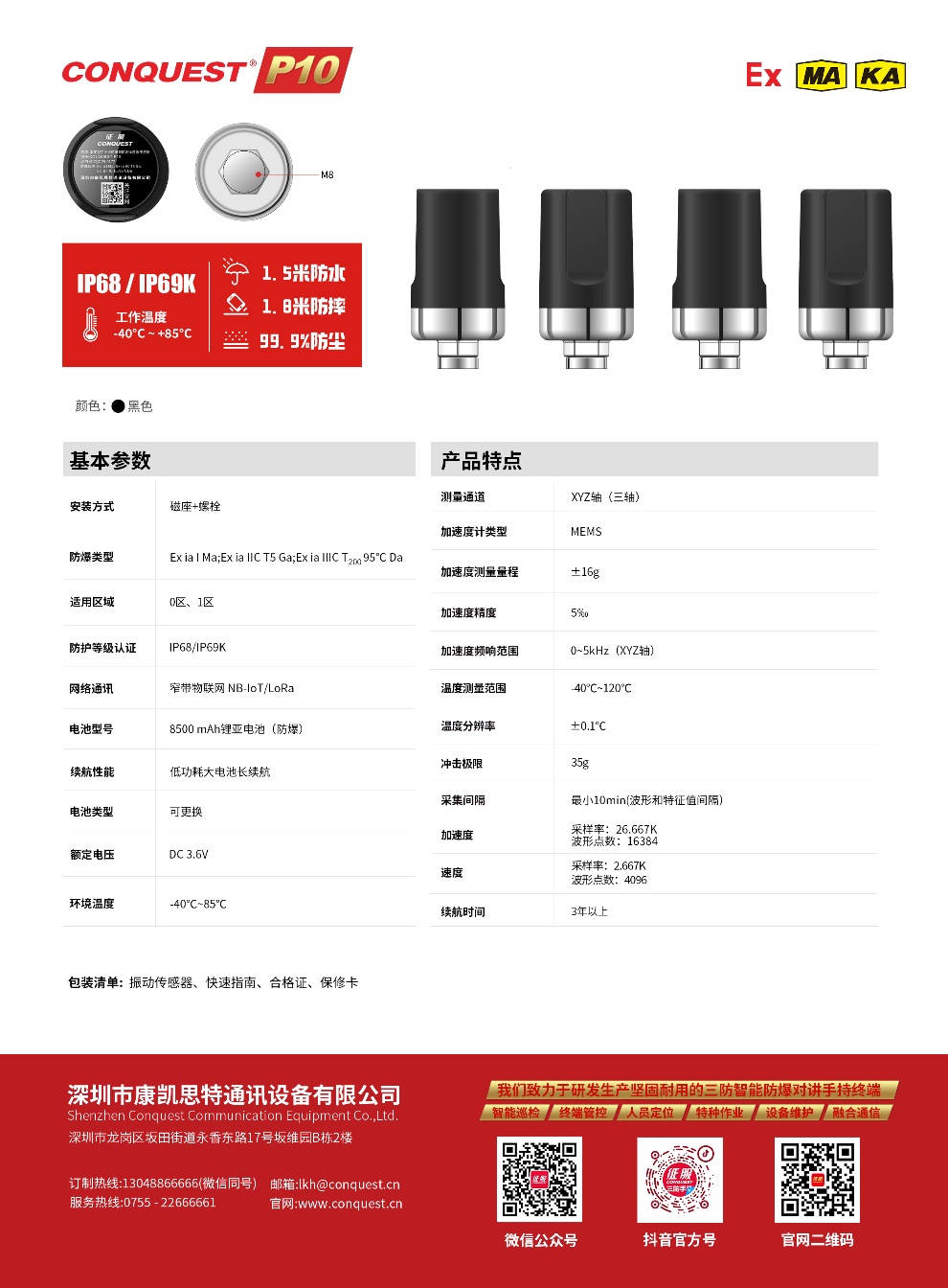 CONQUEST征服P10无线温振传感器是一款集高精度测量、无线传输、超低功耗、防爆安全与智能管理于一体的工业级监测设备。其在实际应用中,是实现设备状态感知数字化、运维管理智能化、安全保障本质化的关键终端,为工业企业的安全生产与降本增效提供有力支撑。