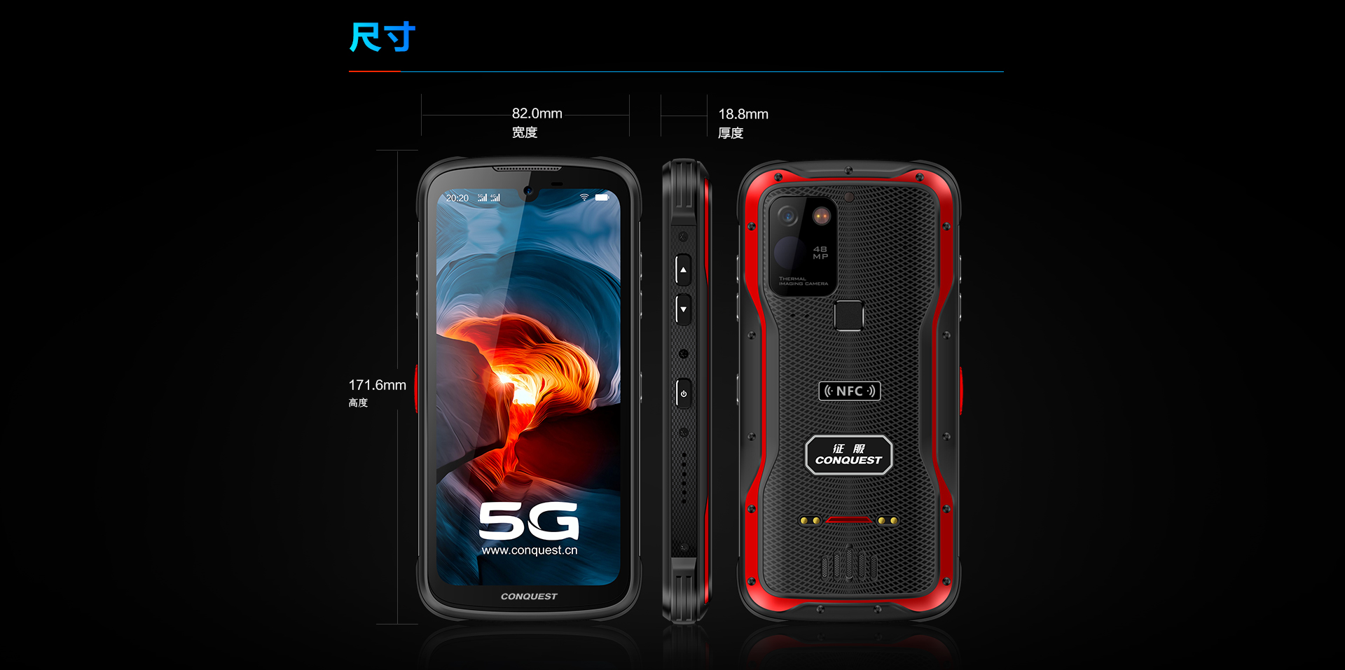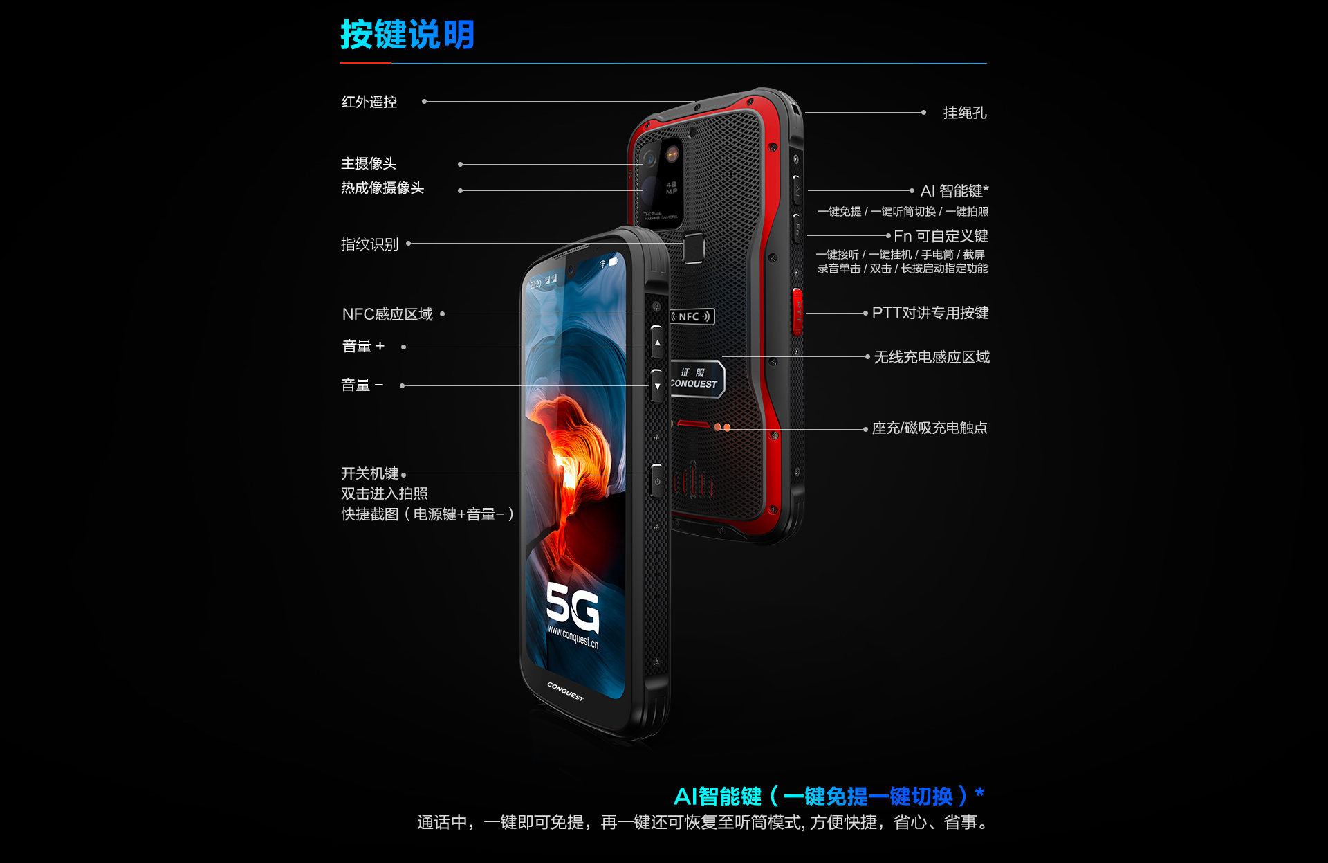 CONQUEST征服S20 5G全网通红外夜视三防智能户外防水手机4800万四摄超长待机手持终端 电力巡检终端