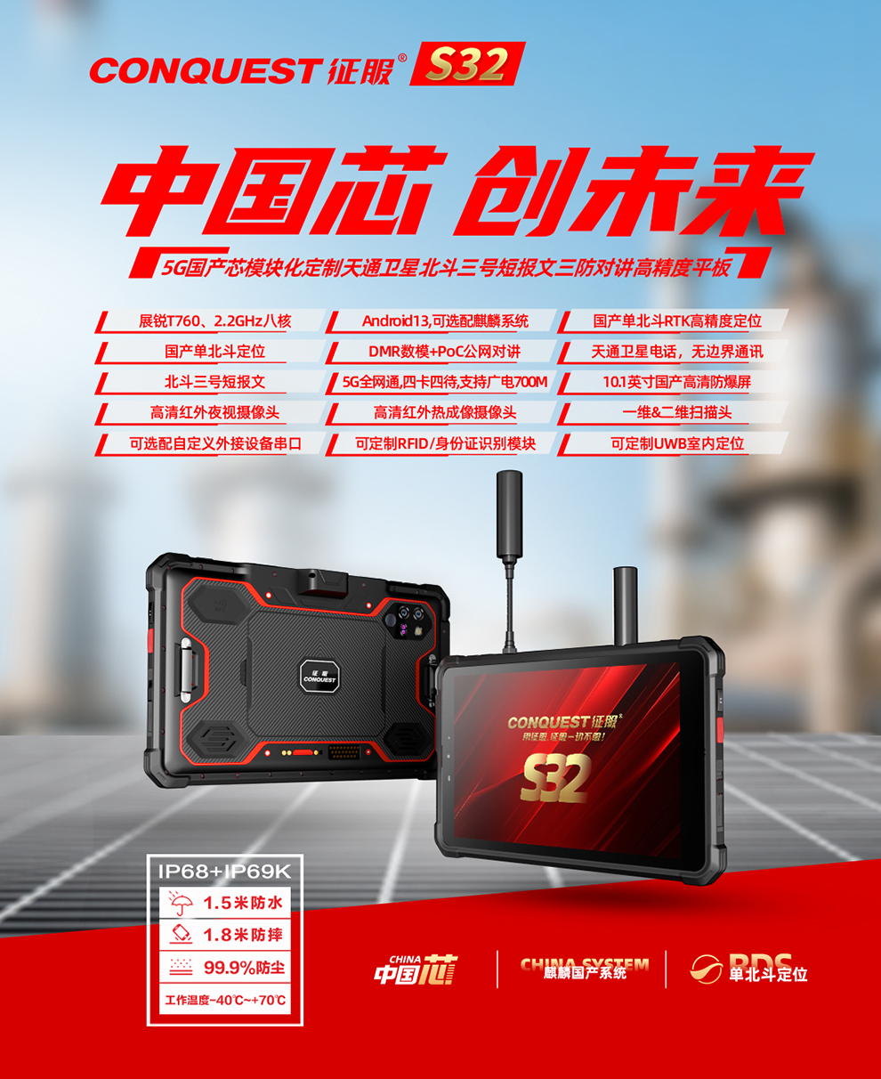 CONQUEST征服S32北斗短报文+天通卫星电话+DMR对讲,5G单北斗高精度定位三防智能平板终端!